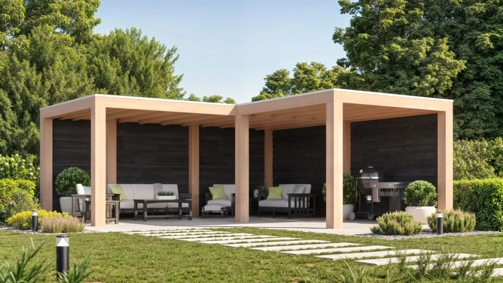 Zoek je meer dan alleen een standaard overkapping? Dan is de Moonstone Excellent hoek model de ideale keuze. Het frame van geschaafd Douglashout met slanke staanders van 19.5×19.5 cm zorgt voor een strakke en moderne uitstraling. De unieke L-vorm van dit model biedt verschillende mogelijkheden met de indeling. Zoals de Moonstone waarbij we met verschillende wanden een beschutte lounge plek creëren.