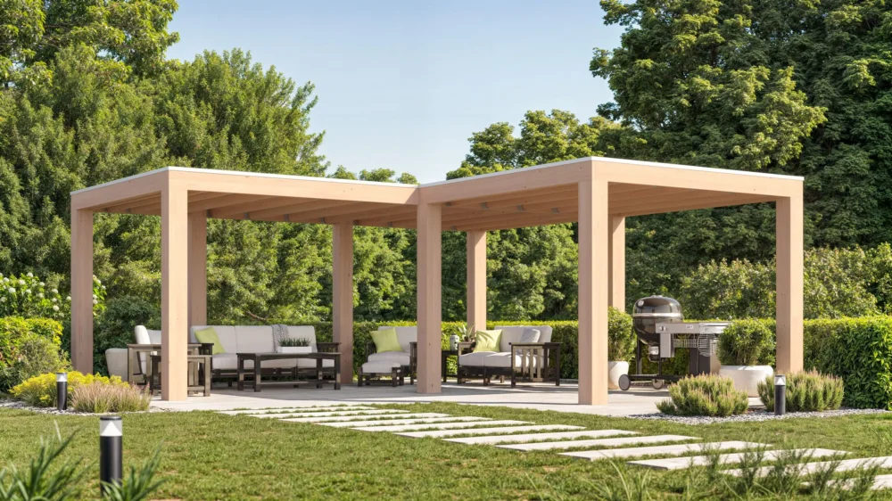 Zoek je meer dan alleen een standaard overkapping? Dan is de Ruby Excellent hoek model de ideale keuze. Het frame van geschaafd Douglashout met robuuste staanders van 19×19 cm zorgt voor een strakke en moderne uitstraling. De unieke L-vorm van dit model biedt verschillende mogelijkheden met de indeling. Of je nu droomt van een uitgebreide buitenkeuken in de ene hoek en een loungeplek in de andere, of een combinatie van opslag en terras: de mogelijkheden zijn eindeloos. Beschikbaar in diverse afmetingen, zodat er altijd een match is voor jouw tuin