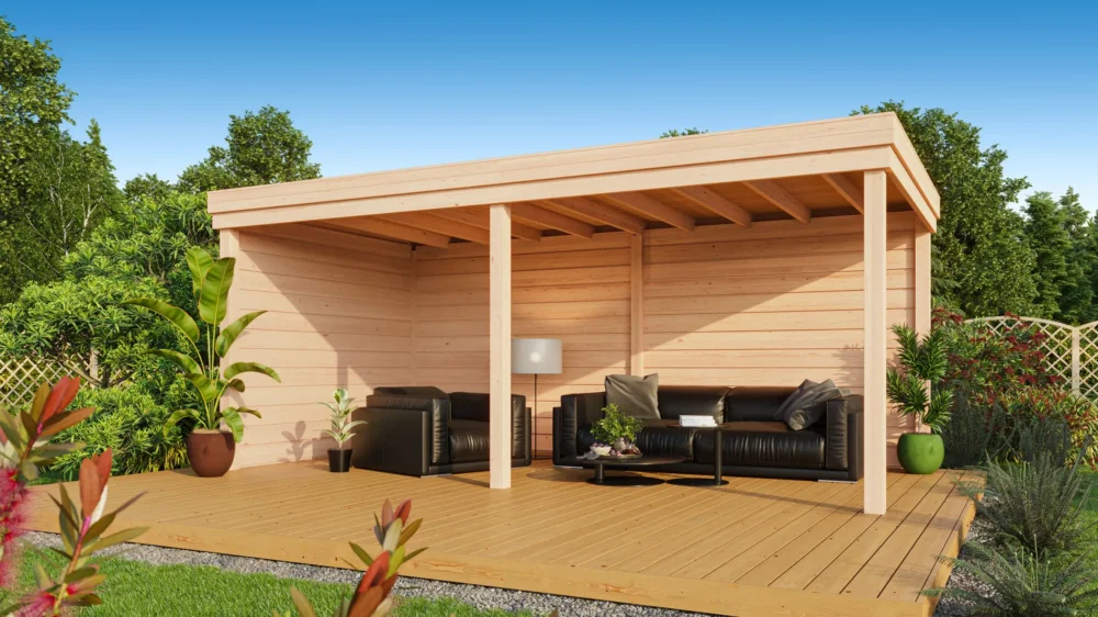 Omdat de modellen van WoodAcademy modulair zijn. Betekent dit dat je meer vrijheid hebt in het bepalen van de indeling van de overkapping. Bepaal zelf aan welke kant je de wanden wilt plaatsen of plaats er een glazen wand in voor extra bescherming van de elementen zonder een opgesloten gevoel te hebben. Omdat er wanden worden gemonteerd dan zijn de schoren ook niet verplicht, zo geef je de Earl een wat meer moderne look en feel. Ook kan het overstek aan de voorkant zelf bepaald worden, door het verschuiven van de palen kun je een overstek creëren tot 60 cm. Let wel op dat dit invloed heeft op je funderingsplan.