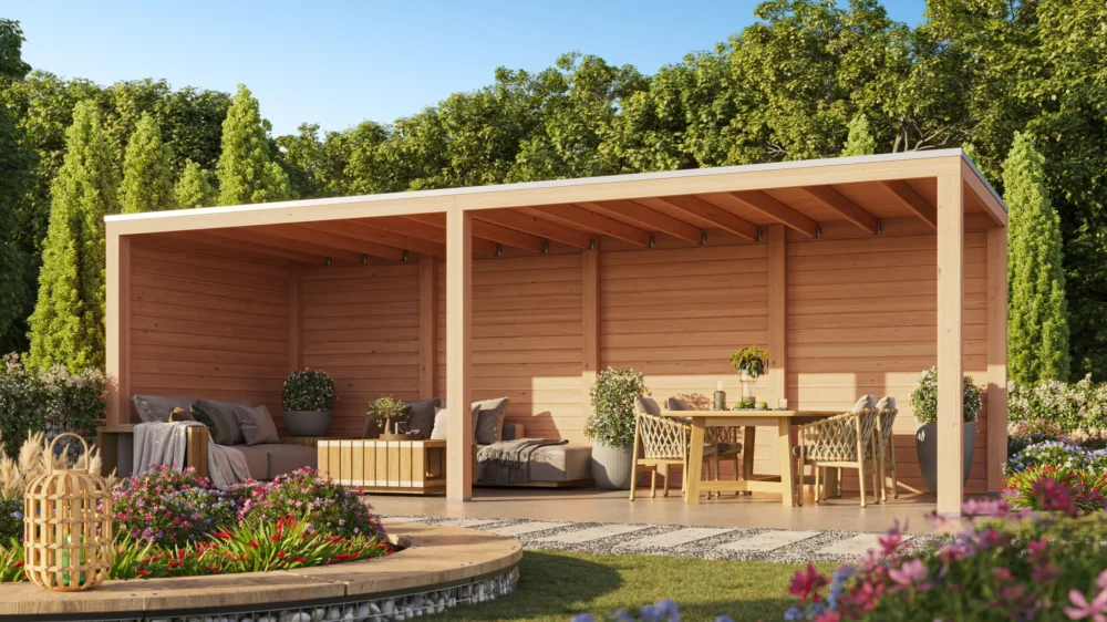 De Moonstone Essential is de ideale vrijstaande overkapping om heel het jaar door onder te kunnen ontspannen en heel het jaar door van je tuin te kunnen genieten. Of je nu je loungeset eronder kwijt wilt of een complete buitenkeuken, de opties zijn eindeloos. Het frame van fijnbezaagd Douglashout met slanke staanders van 15×15 cm zorgt voor een strakke en moderne uitstraling. Standaard leverbaar met enkelzijdige onbehandelde Douglas houten wanden of zwart gespoten vurenhouten wanden.
