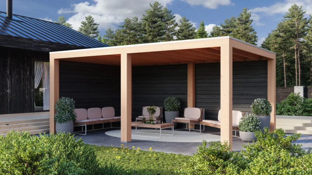 De Moonstone Excellent is de ideale vrijstaande overkapping om heel het jaar door onder te kunnen ontspannen en heel het jaar door van je tuin te kunnen genieten. Of je nu je loungeset eronder kwijt wilt of een complete buitenkeuken, de opties zijn eindeloos. Het frame van geschaafd Douglashout met robuuste staanders van 19.5×19.5 cm zorgt voor een strakke en moderne uitstraling. Standaard leverbaar met enkelzijdige onbehandelde Douglas houten wanden of zwart gespoten vurenhouten wanden.