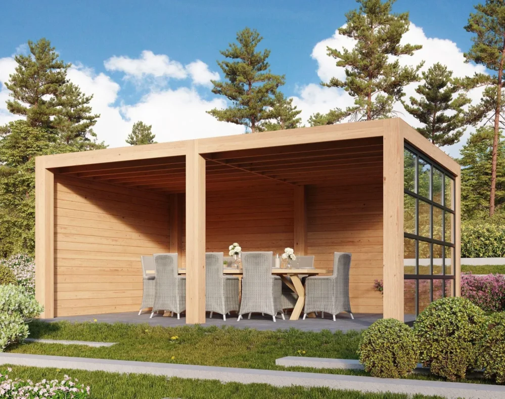 De Onyx Excellent is de ideale vrijstaande overkapping om heel het jaar door van je tuin te kunnen genieten. Of je nu je loungeset eronder kwijt wilt of een complete buitenkeuken, de opties zijn eindeloos. De glaswand aan de zijkant zorgt voor bescherming van de elementen en geeft een gevoel van ruimte. Het frame van geschaafd Douglashout met robuuste staanders van 19.5×19.5 cm zorgt voor een strakke en moderne uitstraling. Standaard leverbaar met enkelzijdige onbehandelde Douglas houten wanden of zwart gespoten vurenhouten wanden.