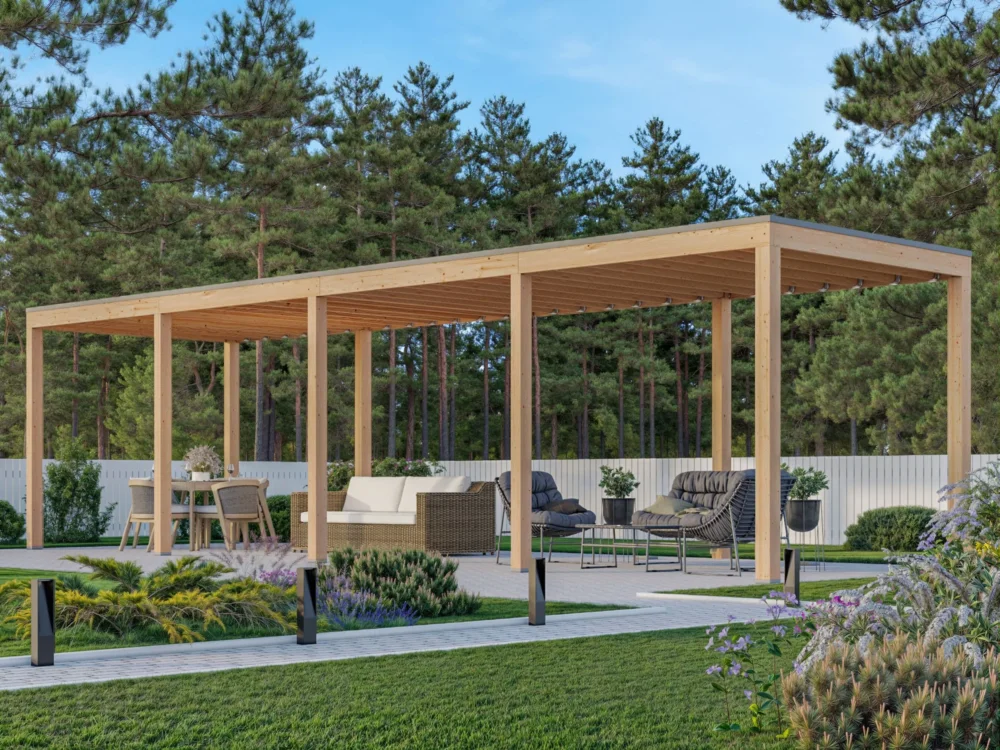 Ontspan heerlijk onder deze Douglas houten overkapping van WoodAcademy. Perfect voor een buitenkeuken, loungebank, of eetplek. De Ruby Essential is het kleine broertje van de Excellent overkapping. Het frame van fijnbezaagd Douglashout met slanke staanders van 15×15 cm zorgt voor een strakke en moderne uitstraling zonder al te robuust over te komen. Verkrijgbaar in verschillende breedtes tot wel 1180 cm en een diepte van 300 of 400 cm.