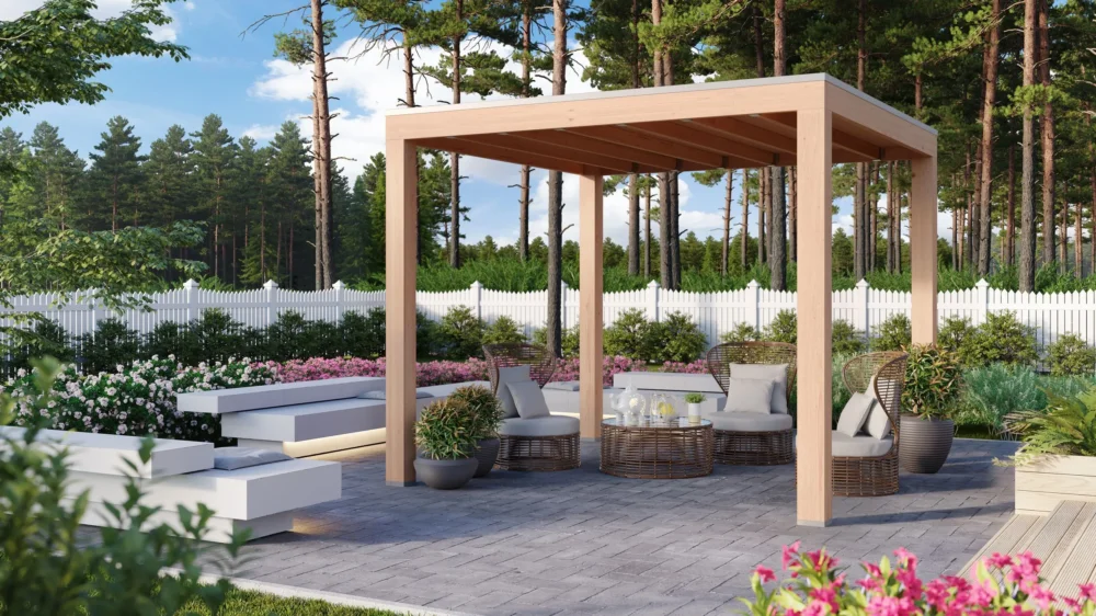 Ontspan heerlijk onder deze Douglas houten overkapping van WoodAcademy. Perfect voor een buitenkeuken, loungebank, of eetplek. De Ruby Essential is het kleine broertje van de Excellent overkapping. Het frame van fijnbezaagd Douglashout met slanke staanders van 15×15 cm zorgt voor een strakke en moderne uitstraling zonder al te robuust over te komen. Verkrijgbaar in verschillende breedtes tot wel 1180 cm en een diepte van 300 of 400 cm.