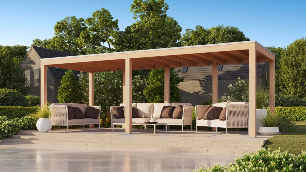 Ontspan heerlijk onder deze Douglas houten overkapping van WoodAcademy. Perfect voor een buitenkeuken, loungebank, of eetplek. De Ruby Essential is het kleine broertje van de Excellent overkapping. Het frame van fijnbezaagd Douglashout met slanke staanders van 15×15 cm zorgt voor een strakke en moderne uitstraling zonder al te robuust over te komen. Verkrijgbaar in verschillende breedtes tot wel 1180 cm en een diepte van 300 of 400 cm.