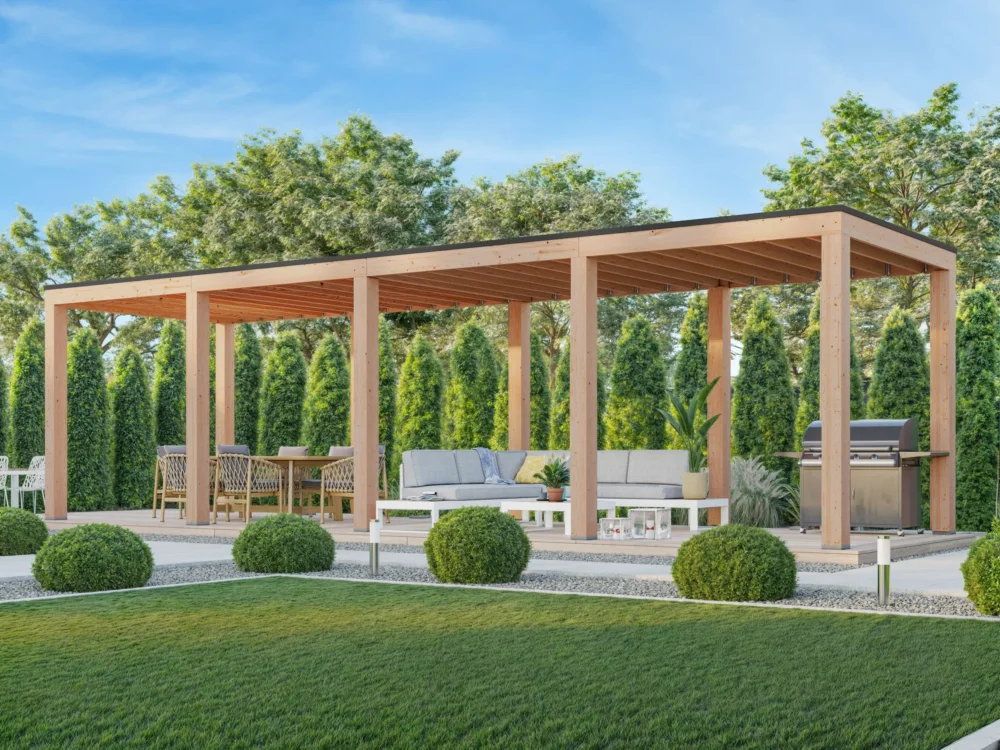 Ontspan heerlijk onder deze Douglas houten overkapping van WoodAcademy. Perfect voor een buitenkeuken, loungebank, of eetplek. De Ruby Excellent is een overkapping met staanders van 19.5 x 19.5 cm, wat zorgt voor een robuuste en moderne uitstraling. Verkrijgbaar in verschillende breedtes tot wel 1180 cm en een diepte van 300 of 400 cm.