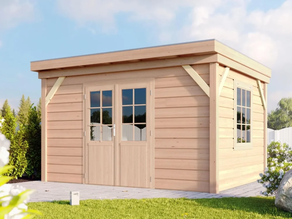 Omdat de modellen van WoodAcademy modulair zijn. Betekent dit dat je meer vrijheid hebt in het bepalen van de indeling van het tuinhuis. Bepaal bijvoorbeeld zelf tijdens de montage waar je de deur en raam wilt plaatsen, of kies voor een volledig houten deur in plaats van eentje met half glas. Ook kan het overstek aan de voorkant zelf bepaald worden, door het verschuiven van de palen kun je een overstek creëren tot 60 cm. Let wel op dat dit invloed heeft op je funderingsplan.