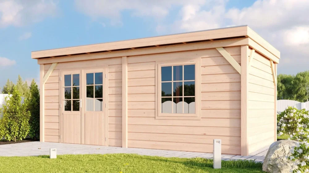 Omdat de modellen van WoodAcademy modulair zijn. Betekent dit dat je meer vrijheid hebt in het bepalen van de indeling van het tuinhuis. Bepaal bijvoorbeeld zelf tijdens de montage waar je de deur en raam wilt plaatsen, of kies voor een volledig houten deur in plaats van eentje met half glas. Ook kan het overstek aan de voorkant zelf bepaald worden, door het verschuiven van de palen kun je een overstek creëren tot 60 cm. Let wel op dat dit invloed heeft op je funderingsplan.