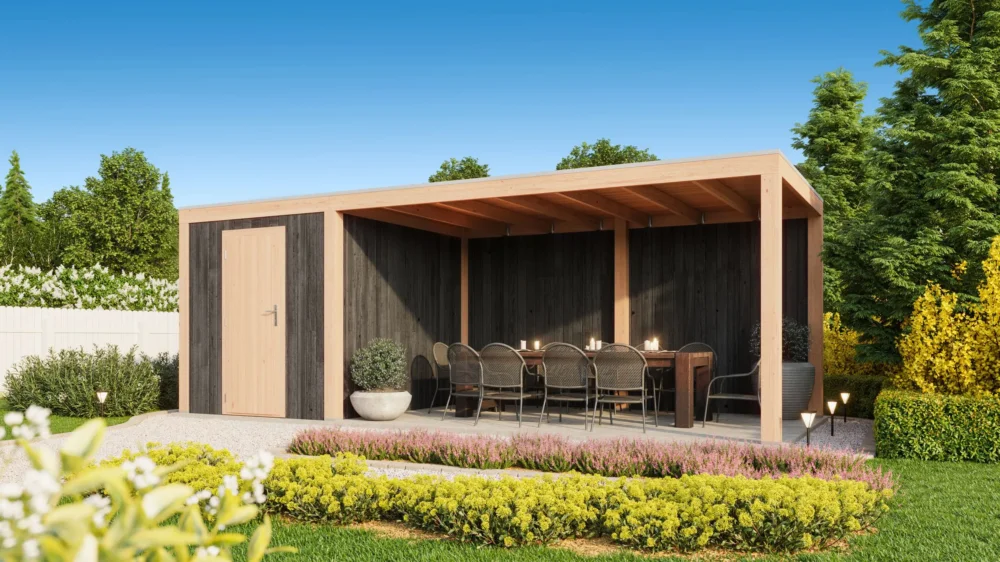 De modellen van WoodAcademy zijn modulair. Dat betekent dat je meer vrijheid hebt in het bepalen van de indeling. Bepaal bijvoorbeeld zelf aan welke kant je het tuinhuis wilt plaatsen, palen kunnen eventueel ook verschoven worden zodat je een kleinere berging hebt en dus meer ruimte hebt voor je favoriete loungebank onder de overkapping. Je kunt ook bepalen waar je de deur wilt plaatsen of bestel er een raam bij voor in het tuinhuis voor natuurlijk licht. Of breid de overkapping uit met een extra wand of glaswand.